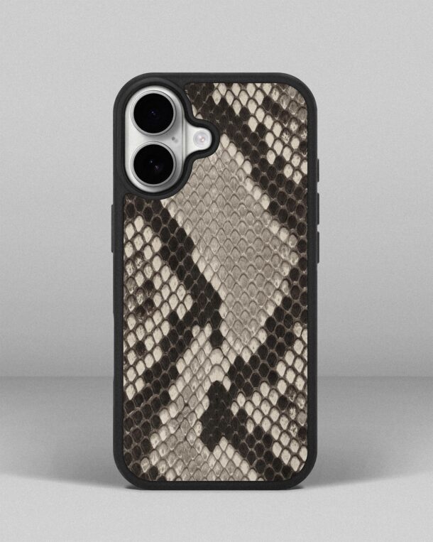 Чорно-біла шкіра пітона привертає увагу своєю конtrасною кольоровою гаммою. Кожна дрібна лусочка має свої унікальні характеристики, створюючи візуальний ефект глибини і грайливості. Чохол із чорно-білої шкіри пітона стане окрасою вашого iPhone 17 , надаючи йому елегантність і розкішний вигляд.